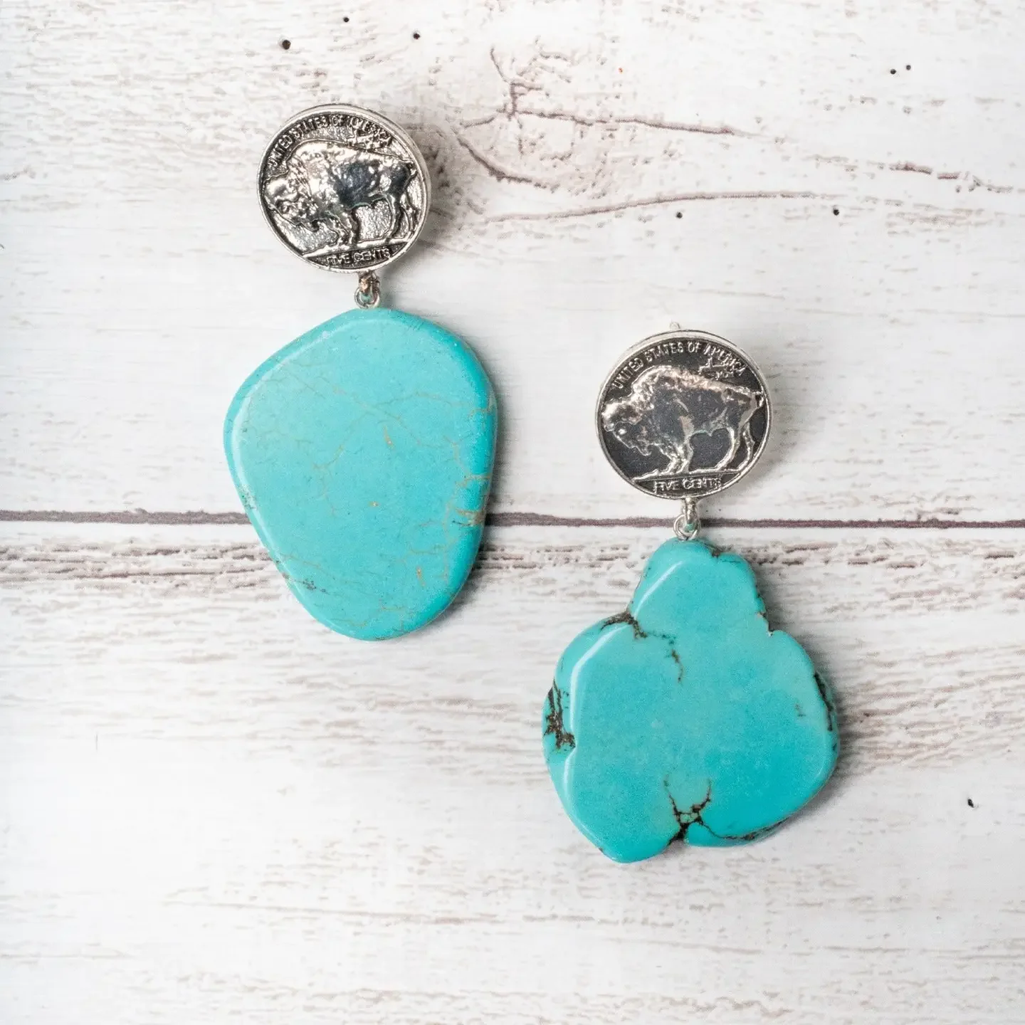 A silver necklace and matching earrings featuring turquoise stones with black veining.