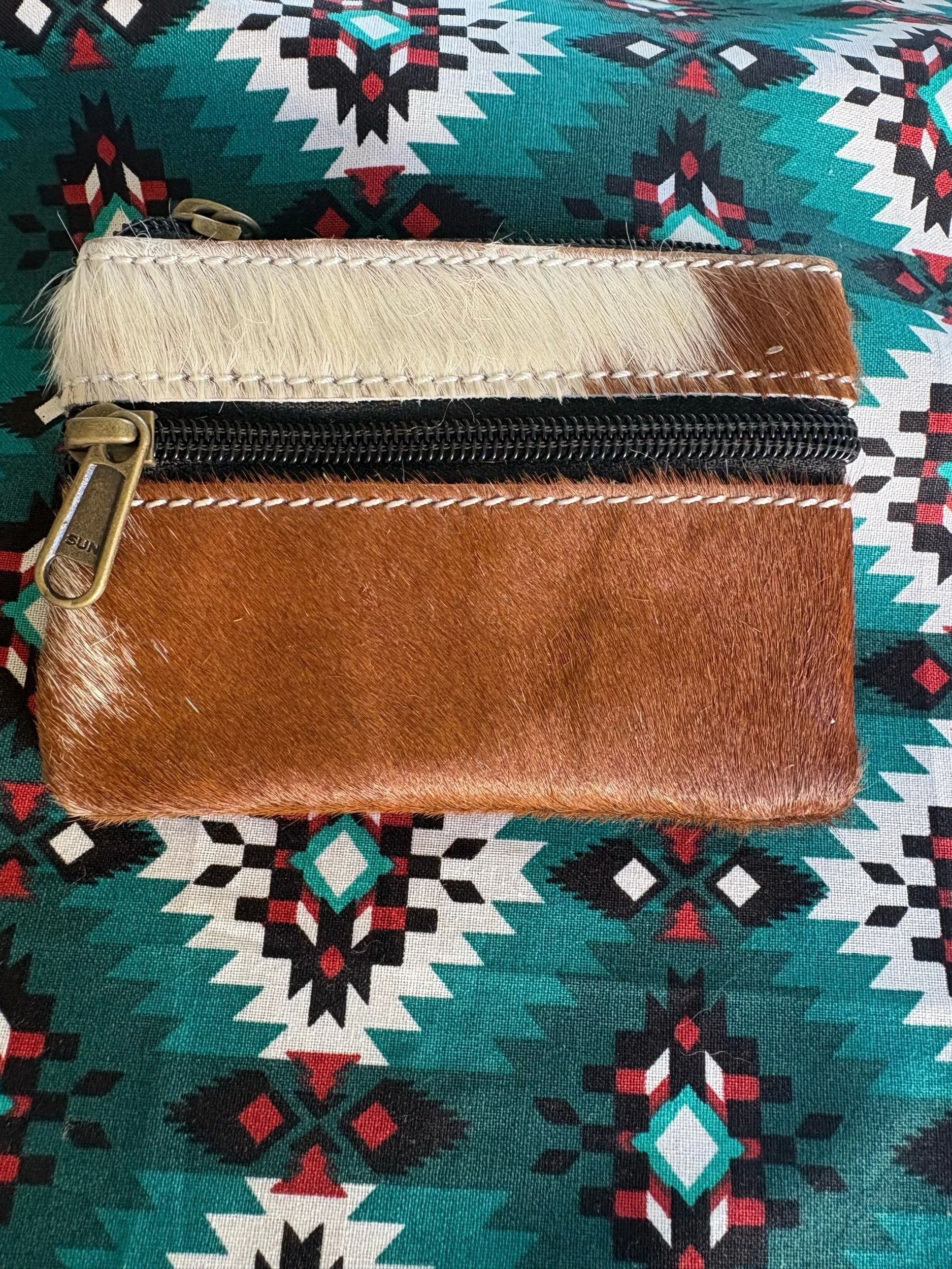 The perfect little coin purse features Genuine cowhide and leather has a top zip close and a front zip pocket addition measures approximately 5” x 3.5”
